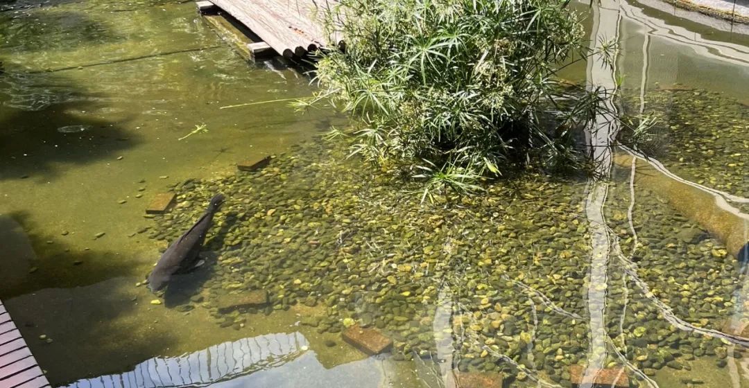 随后大家便前往了再生水处理工艺区参观实际工艺。首先映入眼帘的是飞船大厅前的鲤鱼塘,标明塘里的水就是再生水。带着这样的好奇,我们了解到这个再生水厂采用的工艺流程与国内类似,污水经过沉砂池-第一沉淀池-反应池(活性污泥法、A2O)—第二沉淀池(平流沉淀池、生物膜过滤法)—氯气接触槽—排放。在工作人员的带领下,每到一处工艺工作人员就会为同学们播放生动易懂有趣的自制工艺介绍动漫。同学们发现这里部分经过处理后的水,在使用O3消毒后会变成再生水。日本人将再生水作为日常冲厕、洗车、冲洗停车场等用水。