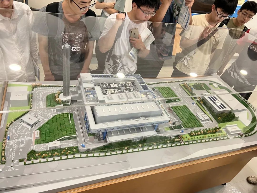 6月26日,同学们前往品川清扫工场,这里整体外观较为美观,用地面积较小,把垃圾处理的接收储存系统、焚烧系统、余热利用系统、灰渣处理系统、烟气净化系统、汽轮发电系统全部放置在同一建筑物内,主厂房为方形建筑,左右两边布置绿化及零星厂房,厂区道路按运输车辆的类型分道,车辆分流环绕通行,交通井然有序。同时,利用地势高差把绿化设置为壁面绿化,并在部分厂房的屋顶和立面设置太阳能光伏发电。烟囱高90米,外围采用不锈钢材质圆柱形铁塔装饰。内部设施人性化,沿着墙壁全方位安装盲人扶手,主要参观点设置盲文图表。全厂密封性很好,不论是在焚烧厂外部还是内部,都闻不到任何异味。