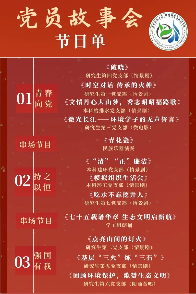 本次活动将由环境学院本科生各专业党支部,研究生党支部围绕祖国75周年诞辰,讲好党史故事,讲好华中大故事开展活动表演,带来精彩演绎。