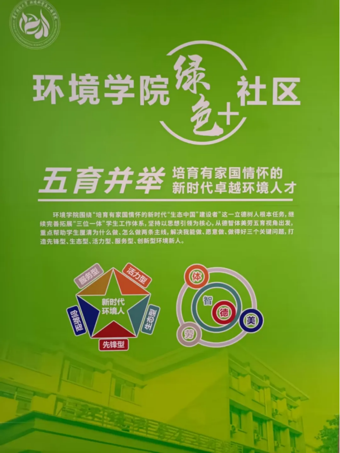 在宿舍楼的一层,镶嵌着学院“环境新人”育人展示长廊。这条长廊从“党建引领、专业发展、文体活动、创新实践、公益服务”五大方面,精心展示了学院的育人理念与成就,激励同学们努力成长为具有家国情怀的新时代卓越环境人才。