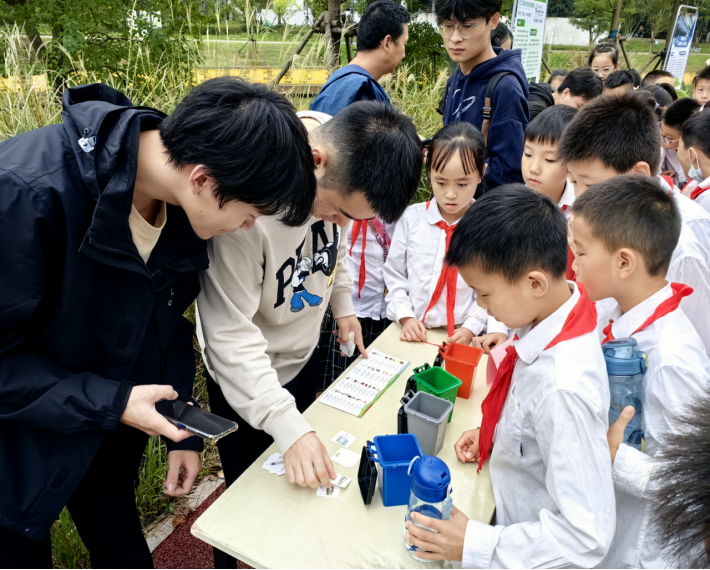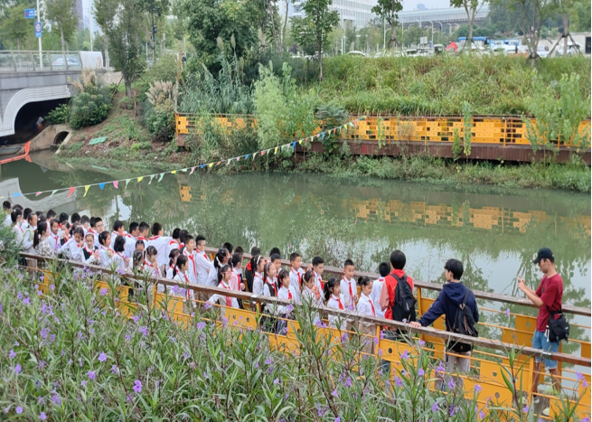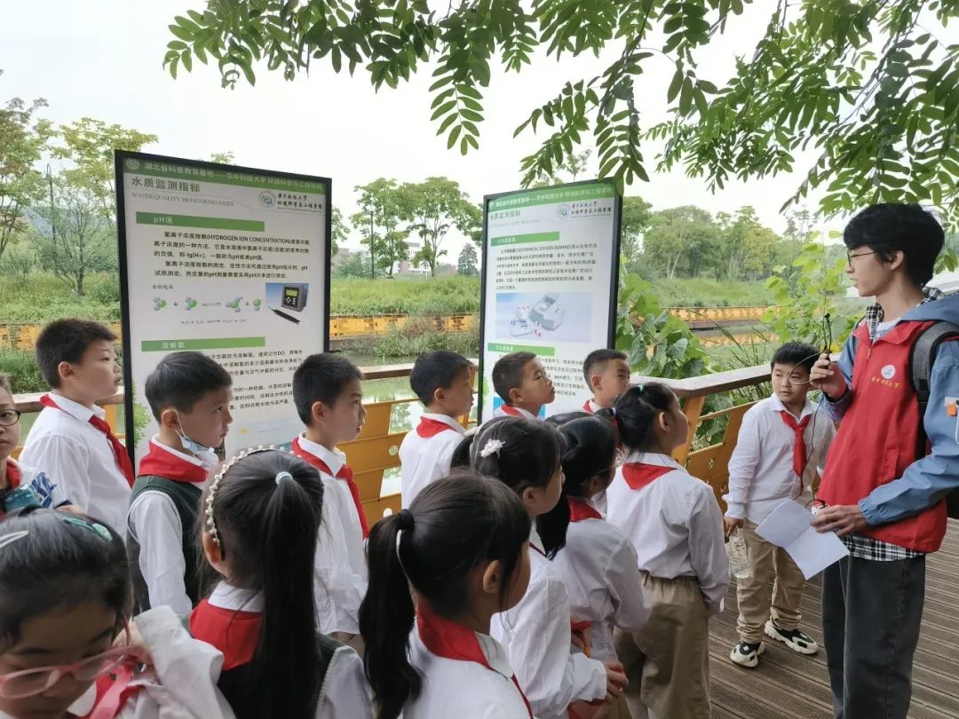 在湖溪河科普站,讲解员带领小同学们沿河查看湖溪河近年来的治理情况,在途中讲解到湖溪河的前世今生:从湖溪河名称的由来,到八十年代被工业污染,再到响应生态文明建设,随着政府与学校的投入和治理,湖溪河重新实现水清岸绿的华丽转身。科学技术是第一生产力。从一条曾经宽1.5米的臭水沟到现在景色优美、环境宜人的湖溪河,其中所涉及到的环境保护技术也由讲解员通过通俗易懂的语言介绍给来访的小朋友们。