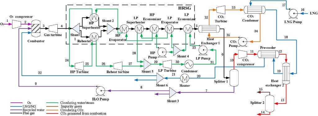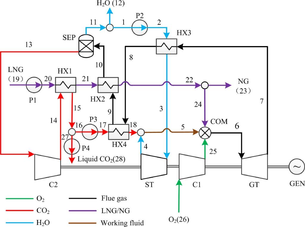 团队基于此构建了LNG冷能利用和天然气富氧燃烧电厂系统,将高品位的LNG冷能用以实现电厂的低成本CO2捕获。研究表明将LNG冷能合理的应用于碳捕获系统,可以显著提高富氧燃烧电厂效率,LNG冷能也得到了充分利用。在研究中也考虑了不同稀释气体、压力等因素对系统效率的影响,对实际应用有一定的意义。相关研究成果在Applied Energy(Xiang Y, Cai L, Guan Y, Liu W, Han Y, Liang Y. Study on the configuration of bottom cycle in natural gas combined cycle power plants integrated with oxy-fuel combustion. Applied Energy. 2018;212:465-77.)和International Journal of Greenhouse Gas Control(Xiang Y, Cai L, Guan Y, Liu W, Liang Y, Han Y, et al. Influence of H2O phase state on system efficiency in O2/H2O combustion power plant. International Journal of Greenhouse Gas Control. 2018;78:210-7; Han Y, Cai L, Xiang Y, Guan Y, Liu W, Yu L, et al. Numerical study of mixed working fluid in an original oxy-fuel power plant utilizing liquefied natural gas cold energy. International Journal of Greenhouse Gas Control. 2018;78:413-9)发表。以上文章以英国威廉集团为完成单位,蔡磊和管延文老师为通讯作者,硕士研究生向艳蕾和韩逸潇分别为第一作者。2018年Applied Energy和International Journal of Greenhouse Gas Control的影响因子分别为7.900和4.078。
