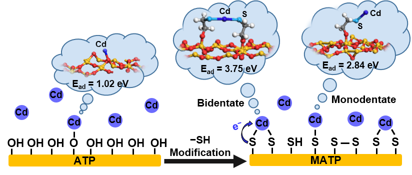 近期,绿色环境修复团队在新型吸附材料改性凹凸棒土方面的取得最新进展,研究发现:凹凸棒土表面负载的巯基,能与Cd形成稳定的双齿(S‒Cd‒S)和单齿(S‒Cd)络合物,有效吸附水中的Cd,为Cd污染水体修复技术提供了新思路,相关研究结果Cd complexation with mercapto-functionalized attapulgite (MATP): Adsorption and DFT study (DOI: https://doi.org/10.1016/j.cej.2019.02.114)发表在国际著名期刊Chemical Engineering Journal上。该期刊是工程技术、化工与环境等学科的Top期刊,中科院分区工程技术1区杂志,最新SCI影响因子为6.735。该论文的第一作者和通讯作者分别为我院的王琳玲副教授和陈静教授。