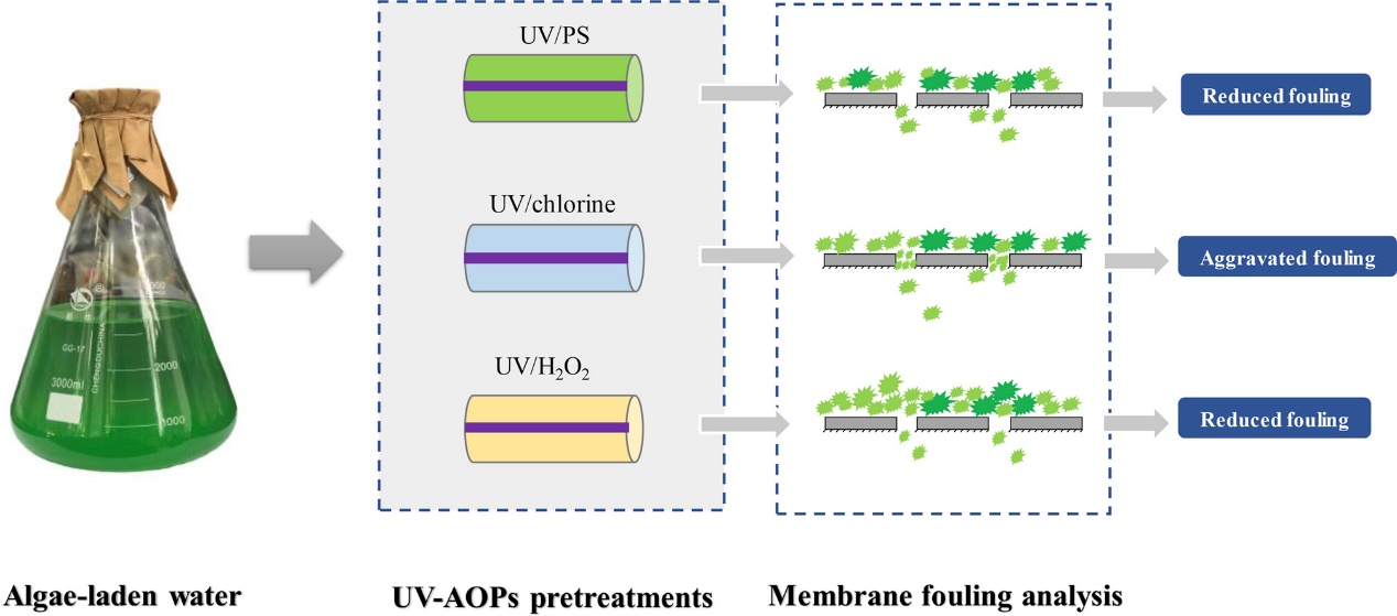 针对饮用水处理中高藻水产生膜污染的问题,本文对比研究了三种常用的基于紫外光的高级氧化技术即紫外/过硫酸盐(UV/PS)、紫外/氯(UV/chlorine)、紫外/过氧化氢(UV/H2O2)预氧化对藻源型膜污染的控制效果。研究结果表明,紫外/过硫酸盐预处理可以有效缓解含藻水产生的超滤膜污染。在相同氧化剂的投加量下,紫外/过氧化氢预处理对膜污染的控制效果稍逊于紫外/过硫酸盐预处理。然而,紫外/氯预处理显著加剧了含藻水产生的膜污染,不可逆污染阻力随着次氯酸钠投加量的增加而增加。紫外/过硫酸盐预氧化能够改变水中大分子有机物的结构并将其转化成小分子有机物,还对藻类有机物具有一定的矿化作用,减少了污染物在超滤膜表面的堆积从而提高了超滤膜的性能。紫外/氯预氧化虽能够有效的将大分子污染物转换为小分子污染物,但是预氧化中生成了大量具有亲水性的小分子物质,其在过滤过程中逐步堆积在膜孔中,造成了严重的不可逆膜污染。