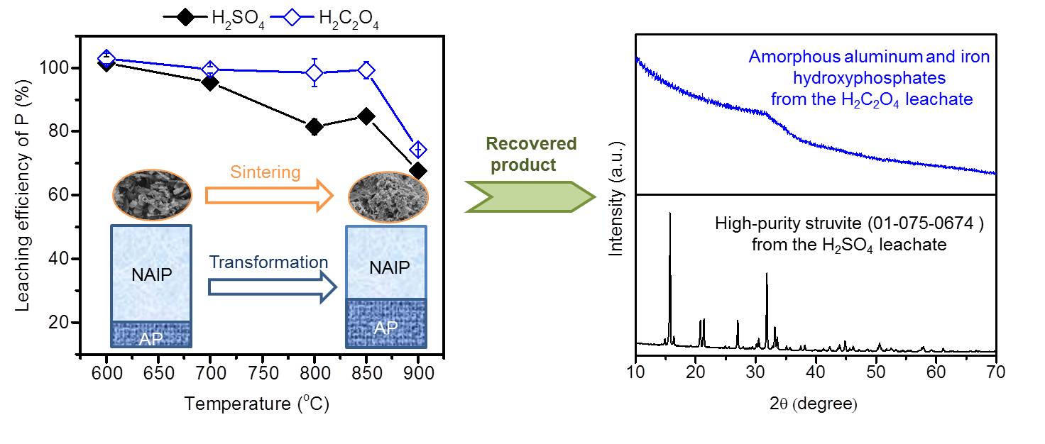 Ca、Al和Fe关键元素的浸出行为。H2C2O4由于与金属离子的络合作用,对于磷的浸出效率略高于H2SO4。在CER净化除杂过程中,H2SO4浸出液中的杂质元素很容易被去除,而H2C2O4浸出液中的Al和Fe元素则由于与草酸根形成了多种阴离子络合物而无法去除。最后,从纯化的H2SO4浸出液中合成了高纯度鸟粪石产品,可直接用作缓释肥;从H2C2O4浸出液中合成了羟基磷酸铝铁化合物,可用作工业原料。