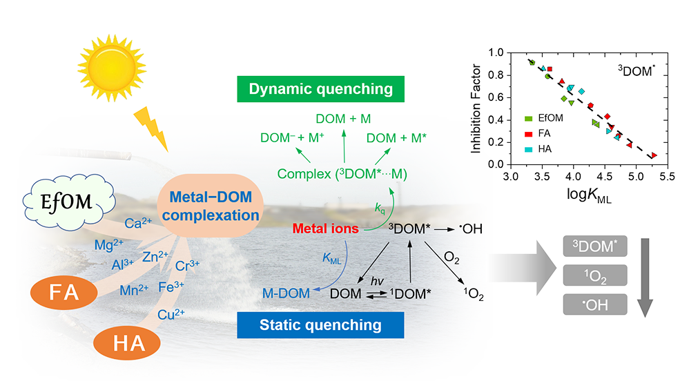 溶解性有机物(DOM)在水环境中几乎无处不在,其在光照下会产生一系列活性物质,如激发三线态DOM(3DOM*)、单线态氧(1O2)和羟基自由基(•OH)等,对水体中污染物的去除产生重要的影响。然而,环境中广泛存在的金属离子对污水处理厂出水有机物(EfOM)和天然腐殖质(包括富里酸(FA)和腐殖酸(HA))等不同来源的DOM光致活性物质产生的影响及其机制并不清楚。该论文首次证明了金属离子与DOM的络合能力和其对3DOM*的猝灭作用呈正相关。一般而言,顺磁性金属离子(例如Cr3+、Mn2+、Fe3+、Cu2+)与DOM具有较高的络合稳定常数(log KML),并且其对DOM产生活性物质的抑制作用也强于其他金属离子(例如Mg2+、Ca2+、Al3+、Zn2+)。不同来源的DOM与金属离子的络合能力顺序为EfOM < HA < FA,表明天然腐殖质的光化学活性更易受到金属离子的影响。