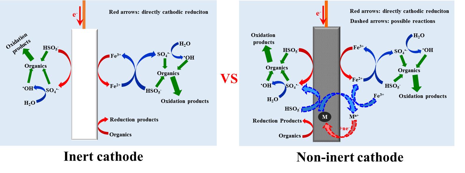该论文采用惰性和非惰性阴极材料(Pt、Cu、 Fe)构建了阴极/Fe3+/过一硫酸盐(PMS)体系用于碘海醇的降解研究。在比较惰性电极和非惰性电极降解碘海醇的过程中发现,输入相对较高的阴极电流时,三种电极体系对碘海醇的降解效率几乎相同。而输入相对较低的电流(不超过1.0 mA/cm2)时,三种电极体系对目标物的降解效率显著不同,其顺序为:Fe-cathode/Fe3+/PMS > Cu-cathode/Fe3+/PMS > Pt-cathode/Fe3+/PMS。研究指出,非惰性电极(Cu、Fe)既传递电子又参与溶液中化学反应,因而能够在更低的电流条件下通过电极表面的氧化还原循环,参与Fe3+/ Fe2+转换和PMS活化,减少化学试剂投加量和提高体系中的自由基(SO4•-和•OH)生成效率,从而实现降低能耗和提高有机污染物降解转化速率的目的。在此基础上,还深入研究了碘海醇在不同体系中的降解反应机理,发现在Cu-cathode/Fe3+/PMS体系中,SO4•-占主导,而在Fe-cathode/Fe3+/PMS和Pt-cathode/Fe3+/PMS体系中,•OH起更大作用,从而导致碘海醇的降解转化途径有所不同。