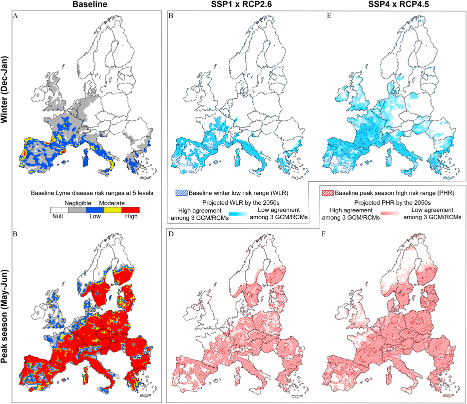 该文章的主要目标是根据对未来社会经济和气候条件的不同假设,预测欧洲莱姆病未来可能的生态风险模式,并探讨预测风险的相似性和不确定性。莱姆病是一种蜱虫传染病,为温带北半球最为流行的媒介传染病,具有极大的社会危害性。文章通过应用基于生态过程的蜱传疾病模型,物种分布模拟和土地利用/覆盖变化情景的最新进展,对欧洲莱姆病的生态风险模式进行了综合的,空间直观的模拟研究。采用利益相关者驱动的综合情景驱动了该模型,这些情景涵盖了多种未来可能的社会经济和气候变化[共享社会经济途径(SSP)与代表性浓度路径(RCPs)]。模型预测表明,未来的温度升高可能并不总是放大莱姆病风险:低排放情景(RCP2.6)与可持续性社会经济情景(SSP1)相结合将导致莱姆病风险降低。在中间(RCP4.5)而非高端(RCP8.5)气候变化情景下,预测风险增幅最大。预测气候和土地利用变化将在塑造未来区域风险动态方面发挥不同的作用,气候变暖可能导致北欧风险扩大,而森林转变为农业可能会限制南欧的风险。