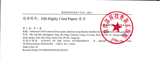 根据Web of Science数据库最新统计数字显示,我院杨家宽教授团队于2018年以威廉williamhill为第一单位发表的论文(Shi, S.Q., Yang, J.K., Liang, S., et al. Enhanced Cr(VI) removal from acidic solutions using biochar modified by Fe3O4@SiO2-NH2 particles. Sci. Total Environ., 2018, 658-629: 499-508)入选了环境科学与生态学学科领域全球前1%“ESI高被引论文”。该论文以15级硕士石顺权和杨家宽教授为共同第一作者,通讯作者为梁莎老师。该论文将为促进我校环境科学与生态学ESI优势学科的稳步前进做出贡献。