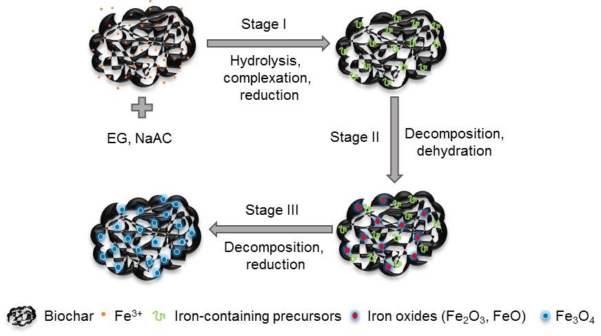 磁性生物吸附剂用于重金属废水处理近年来已有广泛研究。溶剂热法具有操作简单、晶粒形貌粒径可控等优点,广泛应用于功能纳米材料的合成。近年来虽然有众多研究尝试通过溶剂热法制备磁性吸附材料,但大都以氧化石墨烯作为炭基底,以废弃生物质为原料得到的生物炭为炭基底的研究鲜有报道。生物炭表面化学性质复杂,溶剂热反应过程中磁性生物吸附剂的合成机理尚不明确。本论文以梧桐叶生物炭作为基底,以FeCl3•6H2O作为铁源,通过溶剂热法一步合成磁性生物吸附剂,Fe3O4纳米颗粒均匀稳定地结合在生物炭基底上。通过表征和分析不同溶剂热反应时间得到固液相产物的组成变化,提出了非均相溶剂热反应过程中磁性生物吸附剂的合成机理。制备的磁性生物吸附剂对水溶液中的Cr(VI)表现出良好的吸附去除性能。本文研究结果表明溶剂热法是一种制备磁性生物吸附剂材料的有前景的方法。