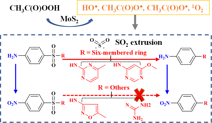 磺胺类药物是一类常用的抗生素,广泛存在于天然水体中并对人体健康具有潜在危害。本论文采用了一种新型的高级氧化工艺,将二硫化钼和过氧乙酸(MoS2/PAA)组合用于去除水体中典型磺胺类药物。结果表明MoS2/PAA体系下可以产生多种活性物质,包括羟基自由基(HO●)、乙酰氧基自由基(CH3C(O)O●)、过氧乙酰自由基(CH3C(O)OO●)和单线态(1O2)。该工艺对磺胺甲噁唑、磺胺胍、磺胺间甲氧嘧啶、磺胺甲基嘧啶等磺胺类药物的去除效果良好。影响因素实验表明该体系的适宜反应pH为3,提高PAA或MoS2的投加量均有利于磺胺类药物降解。产物分析结果表明,MoS2/PAA体系除了使磺胺类药物中的胺基氧化为硝基外,还使具有六元杂环的磺胺类药物发生了SO2挤出反应。