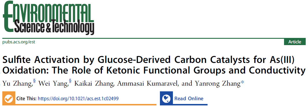 近日,我院张延荣教授团队在环境领域顶级学术期刊Environmental Science & Technology上发表了题为“Sulfite activation by glucose-derived carbon catalysts for As(Ⅲ) oxidation: The role of ketonic functional group and conductivity”的研究论文。本文在同课题组前期研究工作的基础上(Zhang Y et al, Carbon, 2020, 156: 399-409,目前他引18次),首次构建了完全非金属亚硫酸盐活化体系,并对其机理进行了深入解析。研究结果表明,葡萄糖衍生炭能够高效活化亚硫酸盐产生活性硫氧物种(SO3•−, SO5•−和SO4•−),用于水体中高毒性As(III)的高效氧化。构效关系结果表明,醌基官能团和导电性是决定炭材料活性的关键因素。醌基官能团与亚硫酸盐形成炭-硫复合物,并通过分子内电子转移产生半醌自由基和SO3•−,继而通过链式反应产生强氧化性SO4•−。基于醌/半醌/氢醌的可逆性,该催化体系具有良好的循环稳定性。这项研究为亚硫酸盐在环境领域的有效利用提供了研究基础和新思路。