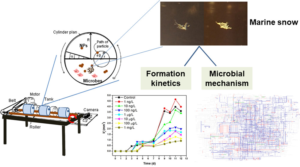 近日,我院付杰教授团队在环境领域顶级学术期刊Environmental Science & Technology上发表了题为“Effect of Nano-Silver on Formation of Marine Snow and the Underlying Microbial Mechanism”的研究论文。探究了纳米银对“海雪”形成的影响及潜在的微生物机制,通过滚台模拟实验和宏基因组测序技术深入解析了纳米银对微生物主导的“海雪”形成的抑制作用。根据前期调研的海洋中纳米银的环境浓度以及水生毒理实验经验,研究人员将7个浓度梯度(1 ng/L, 10 ng/L, 100 ng/L, 1 μg/L, 10 μg/L, 100 μg/L和1 mg/L)的纳米银分别与在中国东海采集的海水混合至于滚台上,旨在模拟海洋中存在的纳米银对“海雪”形成机制的影响。基于高分辨率摄像、粒径分析、生物量测定、及宏基因组测序分析揭示了纳米银通过抑制微生物生长以及主要的功能代谢,特别是胞外聚合物的生成和分泌来抑制“海雪”的形成。