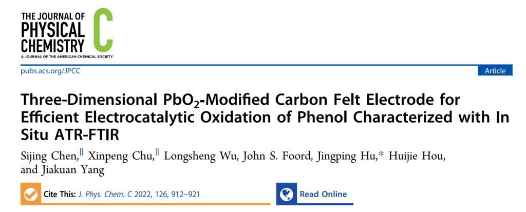 近日,我院Funmat课题组胡敬平教授团队在The Journal of Physical Chemistry C上发表了题为“Three-Dimensional PbO2‑Modified Carbon Felt Electrode for Efficient Electrocatalytic Oxidation of Phenol Characterized with In Situ ATR-FTIR”的研究论文。本文采用电沉积的方法在碳毡(CF)上沉积PbO2,成功制备出了三维电极。与传统的平面二维Ti/SnO2-Sb/PbO2电极相比,三维CF/PbO2电极对苯酚的降解表现出更优越的电催化性能,其降解速率常数为前者的11.2倍。这得益于三维电极高的析氧电位提高了电催化效率,更大的活性比表面积使得苯酚在表面富集,以及多孔的3D结构增强了传质。CF/PbO2电极产生•OH的速率是Ti/SnO2-Sb/PbO2电极的1.3倍。本文还通过原位红外技术手段研究了污染物苯酚在CF/PbO2表面的电催化的降解过程,确定了芳香族中间产物和羧酸为关键反应中间体。该电极具有良好的稳定性和耐用性,并且铅离子浸出可忽略,是一种在电催化降解污染物方面具有良好应用前景的电极。