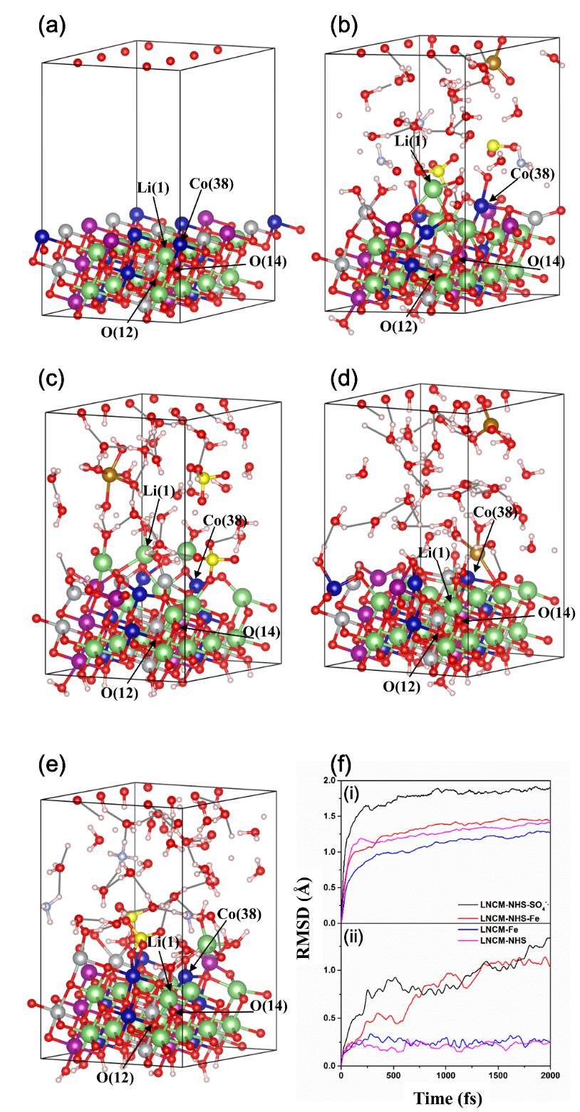 图8.(a)初始LNCM和(b)LNCM-NHS-Fe,(c)LNCM-NHS-SO4•-,(d)LNCM-NHS和(e)LNCM-Fe在1000 fs后的3D结构AIMD模拟;(f):(i)所有原子,(ii)Li和Co原子的RMSD分析。白色、蓝色、紫色、红色和绿色球分别对应Ni、Co、Mn、O和Li原子。