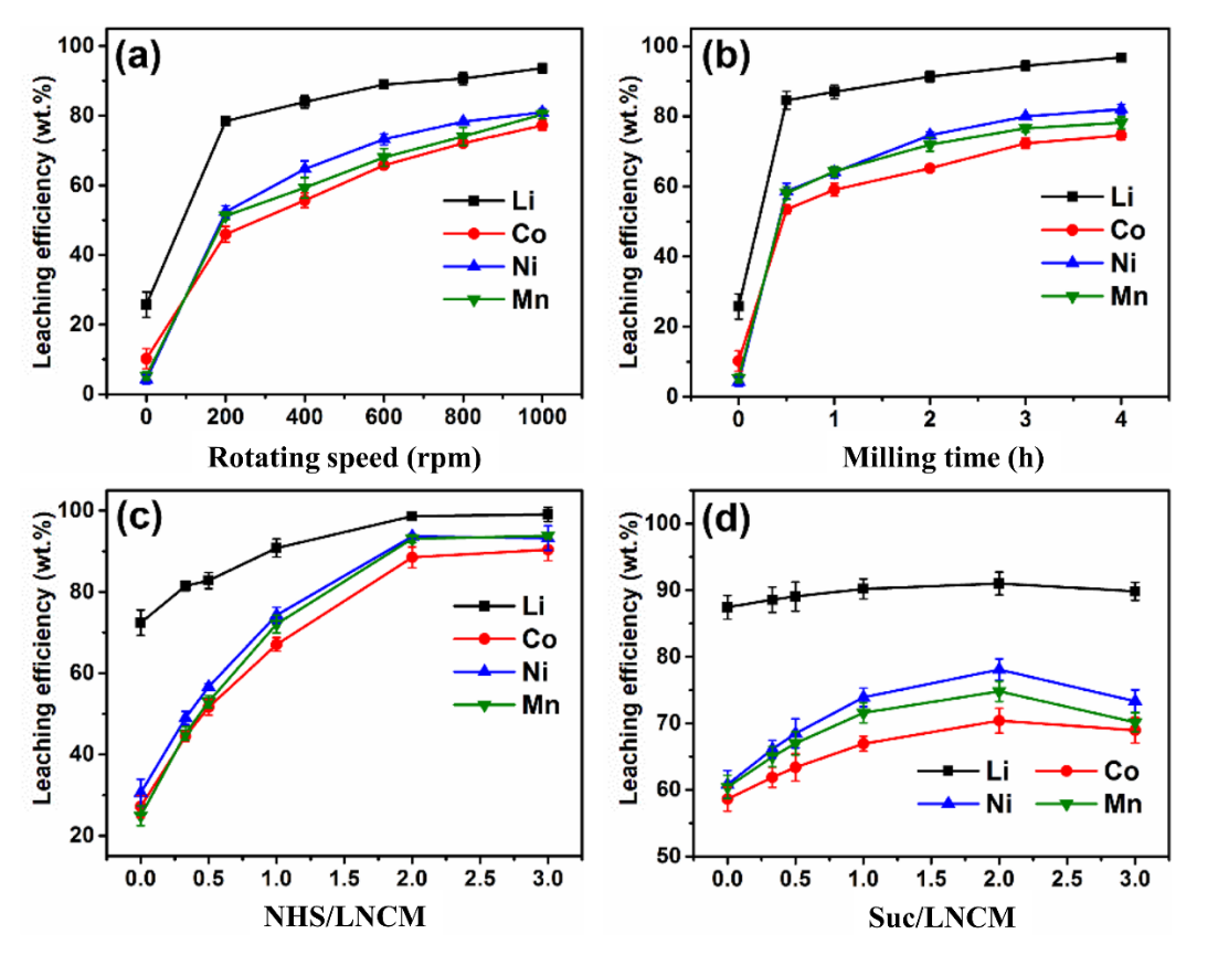 图1. (a)球磨转速、(b)球磨时间、(c)NHS/LNCM质量比、(d)Suc/LNCM质量比对Li、Co、Ni和Mn浸出效率的影响。如无特别说明,球磨条件:转速650rpm,球磨时间2h,NHS/LNCM质量比1:1,Suc/LNCM质量比1:1。浸出条件:30min,pH=2.0,25°C,S/L=25 g/L。