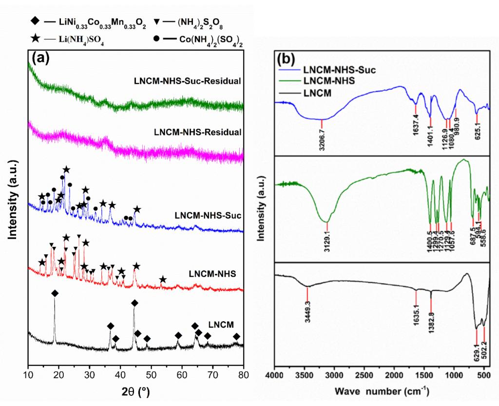 图 4.(a)原始正极材料、球磨产物和浸出残渣的XRD图谱,(b)LNCM和球磨产物的FT-IR图谱。