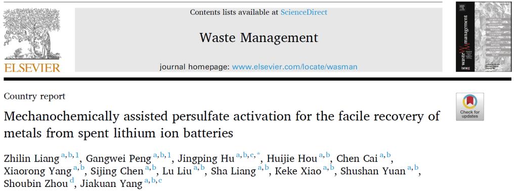 引用:Mechanochemically assisted persulfate activation for the facile recovery of metals from spent lithium ion batteries, Zhilin Liang#, Gangwei Peng#, Jingping Hu*,Huijie Hou, Chen Cai, Xiaorong Yang, Sijing Chen, Lu Liu, Sha Liang, Keke Xiao, Shushan Yuan, Shoubin Zhou, Jiakuan Yang, Waste Management,2022, 150, 290-300.