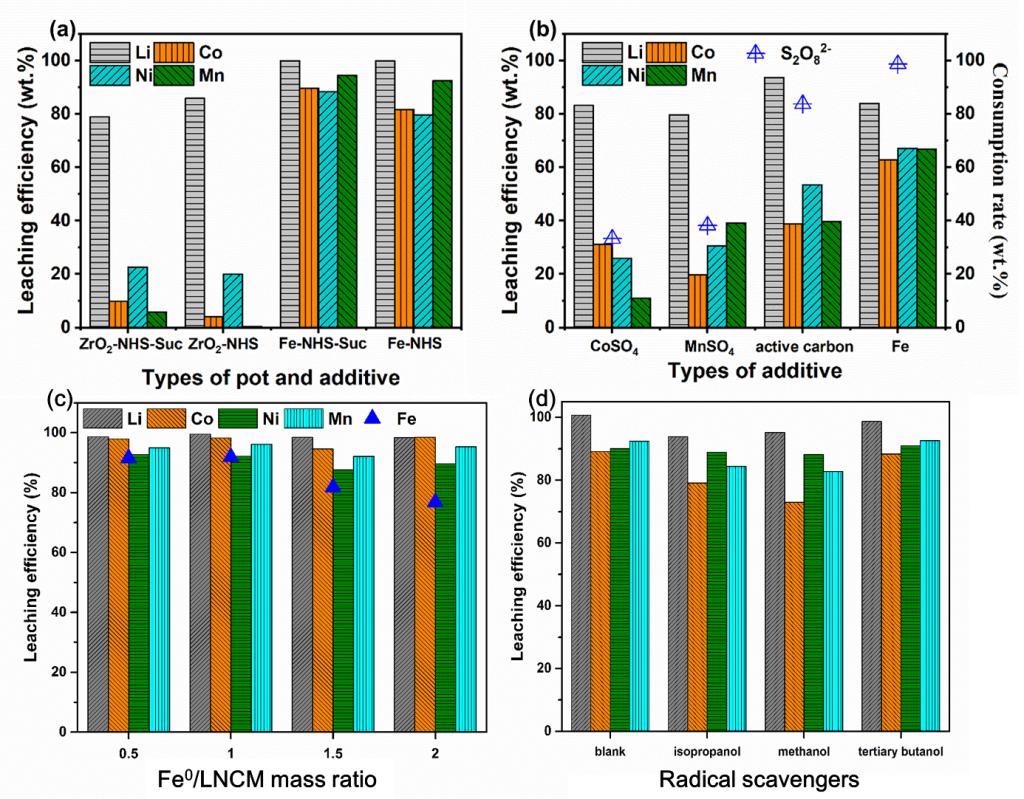 图 7. (a)不同球磨容器材质反应下对金属浸出率的影响;(b) 不同过硫酸盐活化剂对浸出效率的影响; (c) Fe0/LNCM质量比对 Li、Co、Ni、Mn 和 Fe 浸出效率的影响; (d) 自由基淬灭对金属浸出率的影响:(i) 对照组、(ii) 异丙醇(淬灭•OH 和 SO4•-)、(iii) 叔丁醇(淬灭 •OH)和 (iv) 甲醇(淬灭 SO4•-)。