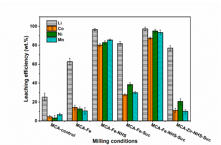 图3. 不同球磨条件下正极材料中有价金属的浸出率:球磨控制组(MCA-Control);球磨-零价铁体系(MCA-Fe);球磨-零价铁-过硫酸盐体系(MCA-Fe-NHS);球磨-零价铁-蔗糖体系(MCA-Fe-Suc);球磨-零价铁-过硫酸盐-蔗糖体系(MCA-Fe-NHS-Suc);球磨-过硫酸盐-蔗糖体系(MCA-Zir-NHS-Suc)。球磨和浸出条件:转速650 rpm,研磨时间2 h,NHS/LNCM和Suc/LNCM质量比2:1,浸出时间30 min,pH=2.0,固液比=25 g/L。