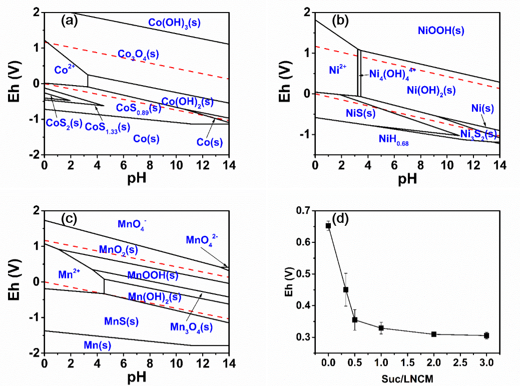 图6.(a)Co-N-S-H2O体系、(b)Ni-N-S-H2O体系和(c)Mn-N-S-H2O体系在实验条件下的Eh-pH相图。模拟条件:温度=100°C,c(Co)=584 mM,c(Ni)=573 mM,c(Mn)=560 mM,c(N)=c(S)=2924 mM。(d)Suc/LNCM质量比对球磨体系Eh值的影响。
