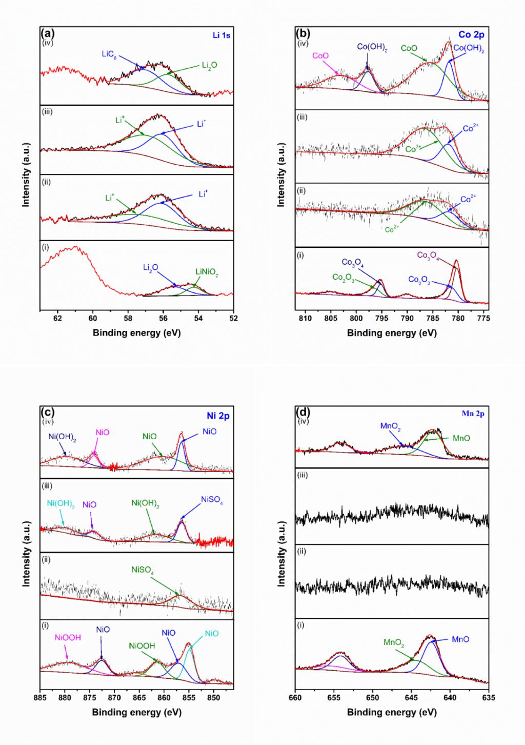 图5. (i)原始正极材料、(ii)正极材料-过硫酸铵体系球磨产物、(iii)正极材料-过硫酸铵-蔗糖球磨产物、(iv) 正极材料-过硫酸铵-蔗糖球磨后浸出残渣的(a) Li 1s、(b) Co 2p、(c) Ni 2p、(d) Mn 2p的XPS表征结果。