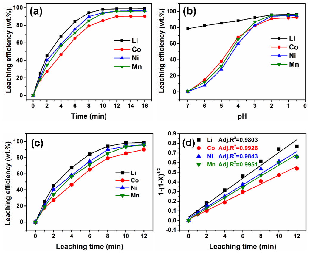 研究还对浸出实验参数进行了优化,以得到最佳金属回收率,分析了浸出温度、时间和pH值对金属浸出效率的影响。浸出时间和pH值的影响如图2a、b所示。金属的浸出率在12分钟内达到最高,为确保金属的完全浸出,选择了15分钟作为最佳浸出时间。图2b表明在pH=7.0时Ni、Co和Mn的浸出率为0,Li的浸出率为80%。随着pH从7.0降低到2.0,有价金属的浸出率显著增加,而金属的浸出率在pH<2.0后几乎没有变化。因此选择pH=2.0作为最佳浸出pH。综合优化结果,最佳球磨参数为:转速800rpm,球磨时间3h,NHS/LNCM和Suc/LNCM质量比2:1,浸出温度25°C,15min在pH值为2.0时。在上述最优条件下,Li、Co、Ni、Mn的浸出率分别可以达到99.1%、96.2%、99.9%和99.2%。在优化条件下,浸出动力学拟合结果表明,浸出过程受表面化学反应控制的收缩核模型调节(图2c,d)。