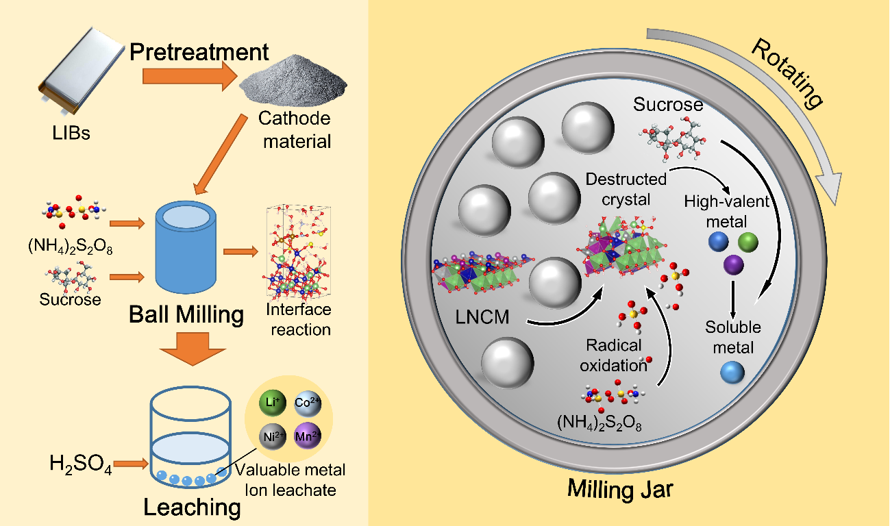 本研究提出了一项通过结合球磨和高级氧化工艺从废旧锂离子电池中高效浸出有价金属的工艺。该方法将正极材料与过硫酸铵和蔗糖在铁质球磨罐中共磨,然后用稀酸浸出,得到锂、镍和锰的浸出效率均在90%以上,对钴的浸出效率在85%以上。机械化学过程和过硫酸铵的存在都加速了浸出过程,零价铁的添加是通过激活过硫酸盐来强化浸出过程的关键因素,这一点也可以从AIMD模拟中得到证实。此外,由于可以控制体系Eh和将有价金属还原为低价态,与蔗糖共磨可以进一步提高浸出效率。通过促进金属氧化物化学键的断裂,这种新工艺可以实现锂离子电池中有价值金属的高效浸出,同时降低试剂消耗、环境压力和成本。