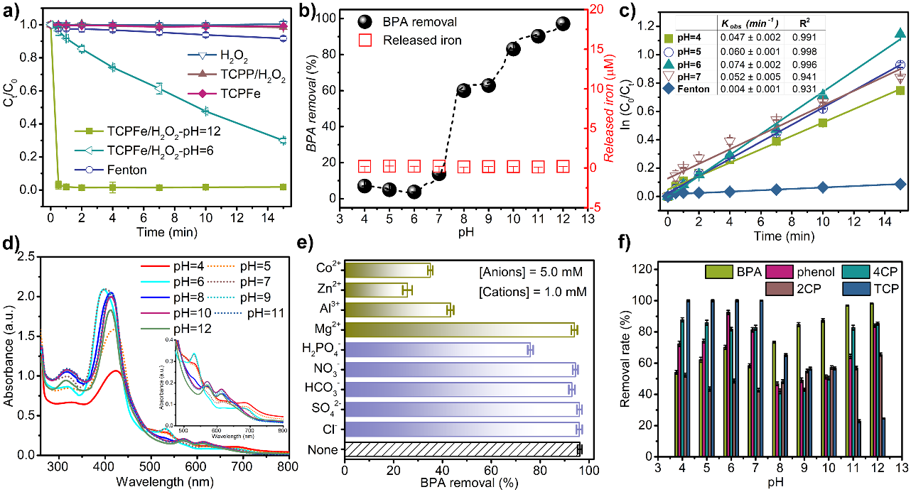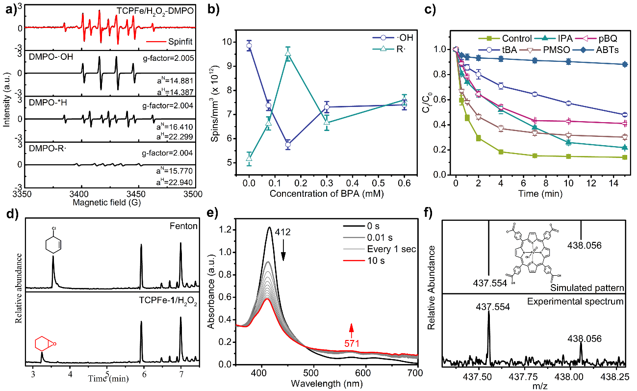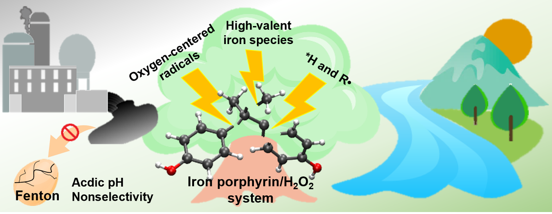 本研究探究了羧基铁卟啉在水溶液中对H2O2的优异活化性能,通过实验识别到多种活性物种的产生,包括氧中心自由基(•OH, HO2•/•O2−)、高价铁氧卟啉((por)Fe(IV)−OH, (por)+•Fe(IV)=O)以及氢原子(*H),结合理论计算揭示了多种活性物种的产生机制及其对双酚A协作降解机理。由于这些活性物种对底物的选择性不同以及协作降解,TCPFe/H2O2 体系对底物的降解表现出高效、抗干扰特性且适用pH范围广,解决了传统Fenton体系的固有缺陷。