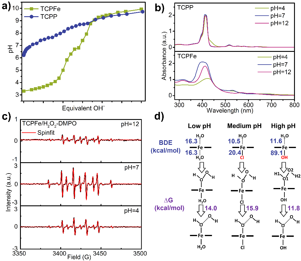 探究了溶液pH对羧基铁卟啉的解离程度的影响,通过对比羧基卟啉的滴定曲线以及在不同pH条件下的光谱特征,推测羧基铁卟啉在不同pH条件下的存在形式。阐明羧基铁卟啉在不同溶液pH条件下对H2O2的活化机制。