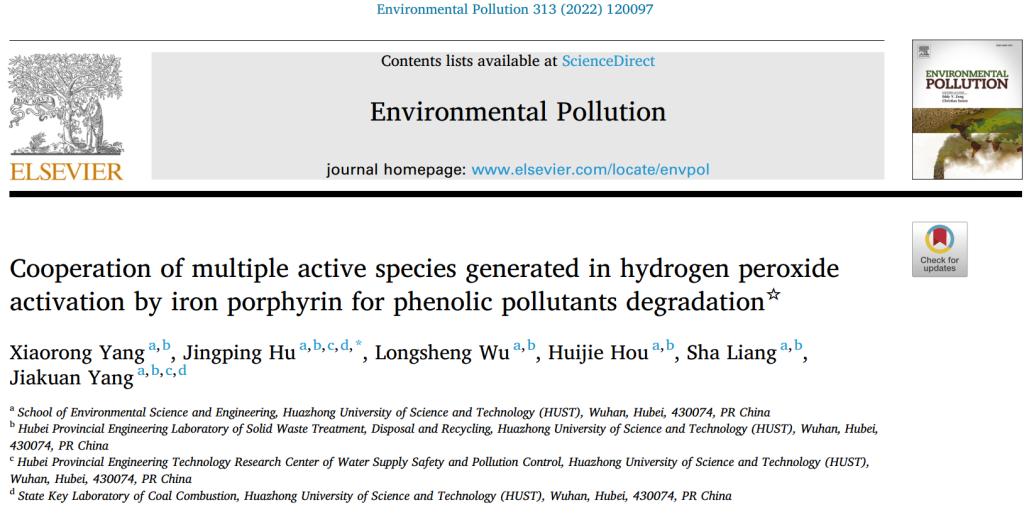 Xiaorong Yang, Jingping Hu*, Longsheng Wu, Huijie Hou, Sha Liang, Jiakuan Yang, Cooperation of multiple active species generated in hydrogen peroxide activation by iron porphyrin for phenolic pollutants degradation, Environmental Pollution, 313 (2022) 120097. https://doi.org/10.1016/j.envpol.2022.120097