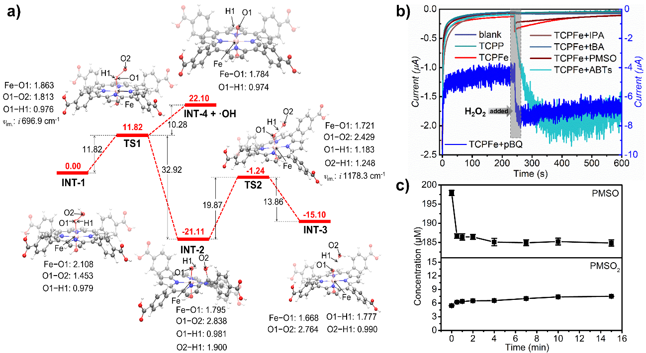 通过理论计算推断羧基铁卟啉对H2O2的活化路径,结合实验方法验证多种活性物种的存在,其中包括氧中心自由基(•OH, HO2•/•O2−)、高价铁氧卟啉((por)Fe(IV)−OH, (por)+•Fe(IV)=O)以及氢原子(*H)。