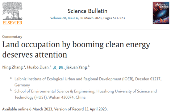 2023年4月,自然科学综合类顶级期刊《Science Bulletin》(科学通报英文版)在线发表了我院杨家宽教授团队关于清洁能源设施土地占用及环境影响的研究成果(Ning Zhang, Huabo Duan*, Jiakuan Yang. Land occupation by booming clean energy deserves attention. Science Bulletin, 2023, 68, 571-573)。该论文通信作者单位为威廉williamhill环境与工程学院。