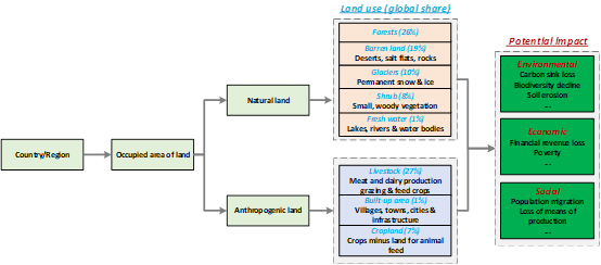 论文通过构建动态模型定量估算了全球(分国家和地区)太阳能、风能、水能等清洁能源的土地占用情况,并探讨了其产生的综合影响。研究结果表明,截止2021年全球清洁能源土地占用面积达到435(±110)万平方公里,约为阿根廷国土面积的1.5倍;单位发电量土地资源占用量(Land Footprint, 土地足迹)明显高于传统化石能源设施;若清洁能源设施占用绿地资源,还可能会降低自然土地的碳汇能力。
