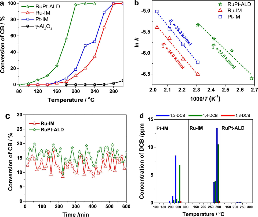 图.(a)氯苯转化率随温度的变化,(b)lnk随逆温度的变化,(c)200℃下氯苯氧化测试的稳定性数据,(d)催化剂上1,2-二氯苯副产物随温度的分布(反应条件:167 ppm 氯苯/5 vol% H2O/空气, GHSV = 20,000 mL/g h,催化剂质量:200 mg)(Applied Catalysis B: Environmental, 2023, 330, 122648)