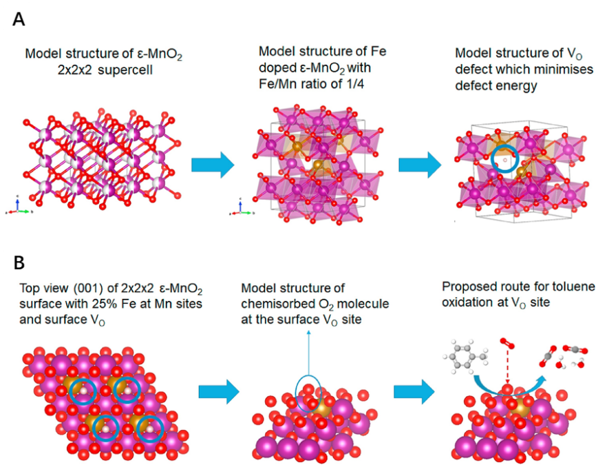 图.理想ɛ-MnO2的模型结构、Fe掺杂ɛ-MnO2的结构以及Fe掺杂ɛ-MnO2的V0缺陷位置(A)和V0位点吸附氧气的模型结构及甲苯催化氧化过程(B)(结果来自DFT计算)(Applied Catalysis B-Environmental, 2021, 286, 119873)