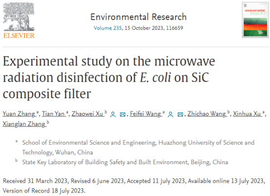 2023年8月,国际期刊《Environmental Research》在线发表了我院徐新华教授团队研究成果(Experimental study on the microwave radiation disinfection of E. coli on SiC composite filter, Environmental Research 2023, 235, 116659)。英国威廉集团为论文第一署名单位。《Environmental Research》作为环境科学与工程领域的权威国际期刊,2023年公布的最新影响因子为8.3。