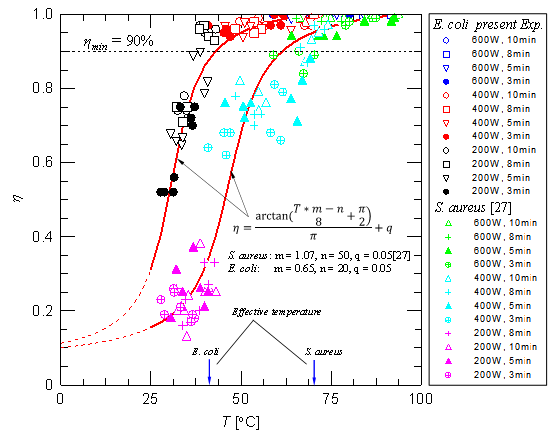 图3 不同灭菌功率和灭菌时间下灭菌率与温度的对应关系