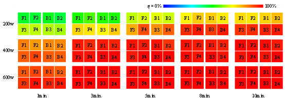 图2 不同灭菌功率和灭菌时间下各测点大肠杆菌的灭菌率变化
