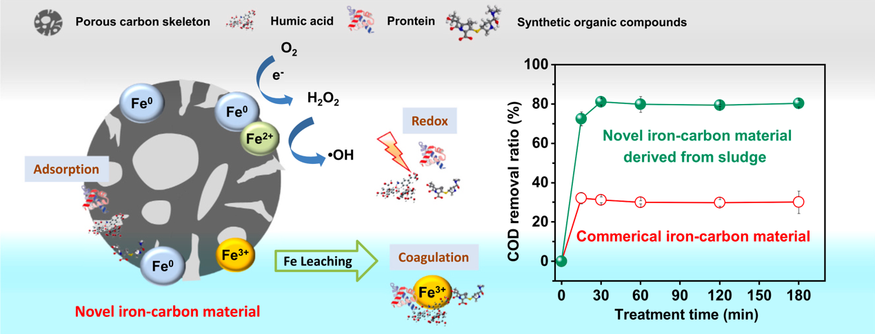 老龄垃圾渗滤液成分复杂,是一种难处理的有机废水,需要同时进行物理和化学预处理。本研究以市政污泥为原料合成了一种新型铁碳(Fe-C)材料,并将其用于垃圾渗滤液的预处理。当Fe-C材料制备温度为900℃,Fe/C质量比1.59,Fe-C材料与渗滤液的固液比为34.7 g/L时,垃圾渗滤液中COD去除率达到79.44%,是普通市售Fe-C材料(30.1%)的2.6倍。这是因为污泥基Fe-C材料具有良好的介孔结构和均匀的零价铁分布。通过对比实验,证实了Fe-C材料对垃圾渗滤液COD去除的贡献顺序为混凝、吸附、氧化还原效应。处理后的渗滤液中溶解有机物(DOM)中CHO、CHON和CHOS化合物含量降低,脂质、木质素和单宁酸的分子量和不饱和度均降低,同时处理后的渗滤液中一些新生成的小分子DOM进一步证实了氧化还原作用对渗滤液中DOM的降解作用。本研究拓展了污泥资源化利用途径,并为垃圾渗滤液预处理技术提供了新的思路。