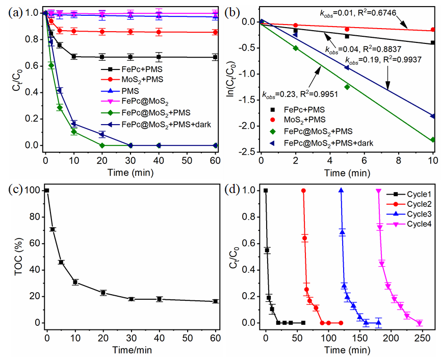 图2.(a)不同体系中CBZ的降解情况;(b)不同体系的一级反应动力学拟合;(c)CBZ降解过程中TOC的变化;(d)FePc@MoS2/PMS体系的循环实验。实验条件如下:[CBZ]=5 mg/L,[FePc@MoS2 (30 wt%)]=0.2 g/L(Fe含量:1.06Í10-4 mol/L),[FePc]=0.2 g/L(Fe含量:3.5Í10-4 mol/L),[MoS2]=0.2 g/L,pH=3,[PMS]=5 mM。