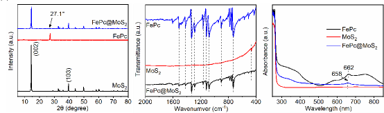 图1.FePc@MoS2 (30 wt%)、MoS2和纯FePc催化剂的测试对比图:(a)X射线衍射(XRD)图,(b)傅里叶红外变换光谱图(FTIR)和(c)紫外-可见光谱(UV-Vis)