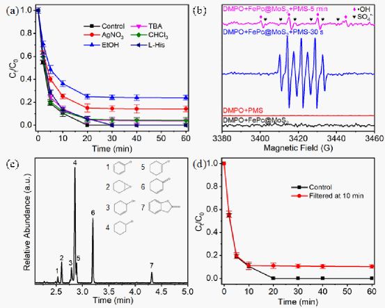 图4.(a)AgNO3、EtOH、TBA、CHCl3和L-His对CBZ降解的影响([AgNO3]=250 mM,[其他猝灭剂]=1000 mM);(b)使用DMPO在各种体系中捕获的EPR光谱([DMPO]=30 mM);(c)环己烯氧化产物的GC-MS光谱;(d)在10分钟过滤后的CBZ降解曲线。实验条件:[FePc@MoS2 (30 wt%)]=0.2 g/L,[CBZ]=5 mg/L,pH=3,[PMS]=5 mM。