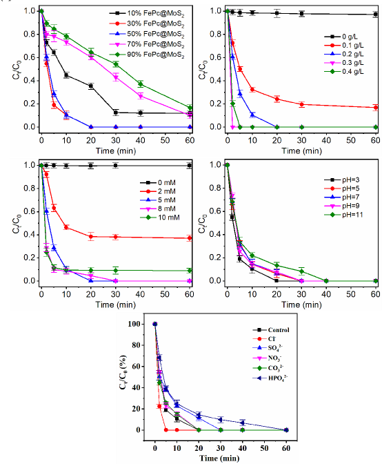 图3.各种条件对CBZ降解的影响:(a)FePc含量;(b)FePc@MoS2催化剂的量;(c)PMS剂量;(d)pH值;以及(e)阴离子。实验条件:[FePc@MoS2]=0.2 g/L,[CBZ]=5 mg/L,pH=3,[PMS]=5 mM和[Cl-]=[SO42-]=[NO3-]=[CO32-]=[HPO42-]=100 mM。