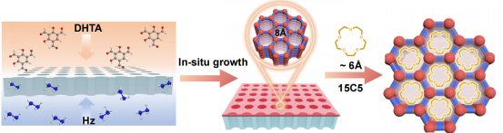 通过在双通道阳极氧化铝(AAO)支持体上进行单体的原位生长,随后进行冠醚的后修饰,形成DHTA-Hz-15C5膜。采用2,4-二羟基苯-1,3,5-三甲醛(DHTA)和水合肼(Hz)分别在有机相和水相中进行聚合反应,形成DHTA-Hz膜。接着引入15-冠-5醚(15C5),其较小尺寸(~6 Å)与一维纳米通道(8.4Å)相结合,确保了稳定的结合且不改变表面特性。这种复合型结构一方面保留了COF一维通道快速传输的优势,另一方面离子特异性识别的分子引入可实现目标离子的选择性分离。