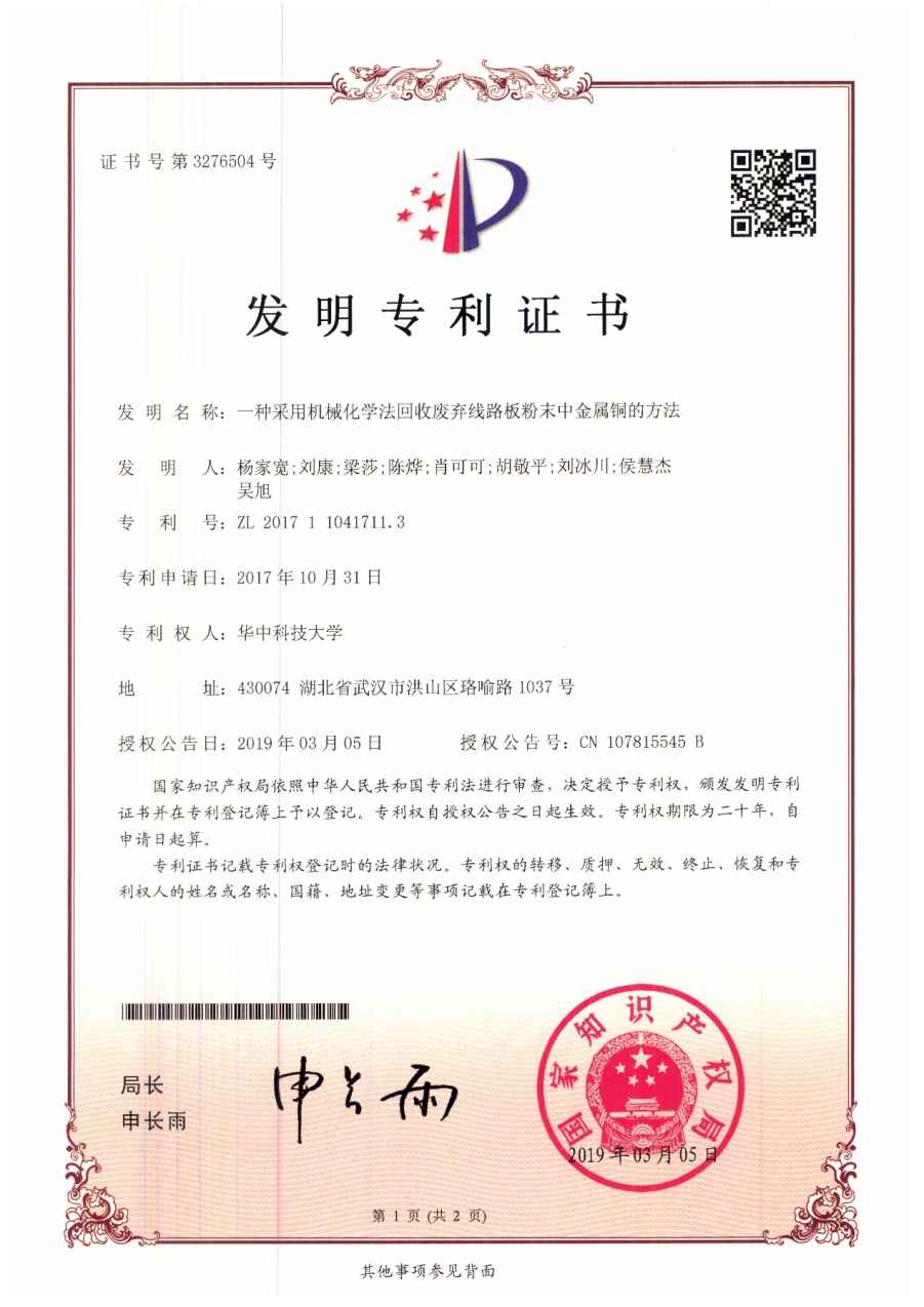 近日,杨家宽教授团队授权国家发明专利1项:一种采用机械化学法回收废弃线路板粉末中金属铜的方法,专利证号ZL 201711041711.3,授权公告日:2019年3月5日,专利权人为威廉williamhill,第一发明人为杨家宽教授。该专利创新性提出了一种机械化学法回收废弃线路板粉末中金属铜的方法,采用固体过硫酸钾为原料,与废弃线路板粉末进行球磨发生机械化学反应,进而通过水浸重结晶的方法回收铜。此方法避免了强酸浸出剂的使用,有效地解决了酸性或碱性废水污染环境的问题。