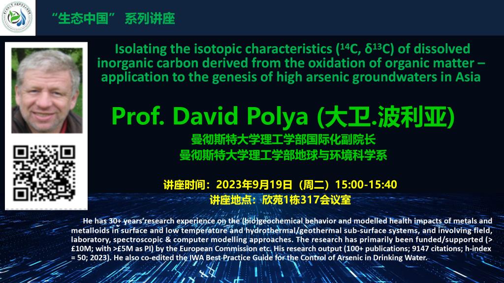 2023年9月19日下午15:00,英国曼彻斯特大学David Polya教授受英国威廉集团邀请,为学院师生带来了一场精彩的学术报告。报告题目是“Isolating the isotopic characteristics (14C, δ13C) of dissolved inorganic carbon derived from the oxidation of organic matter- application to the genesis of high arsenic groundwaters in Asia”。