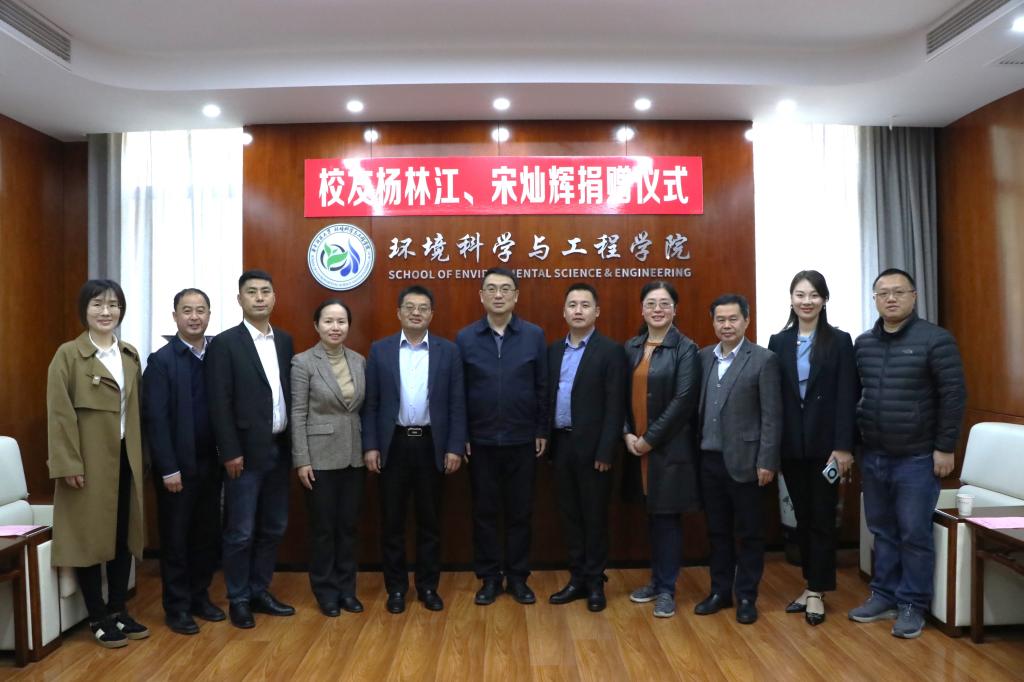 校友杨林江、陈翔宇向环境学院党委书记刘利剑、院长杨家宽赠送捐赠支票。