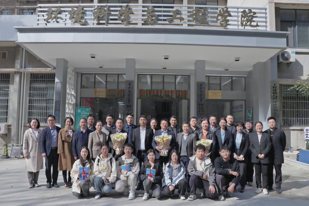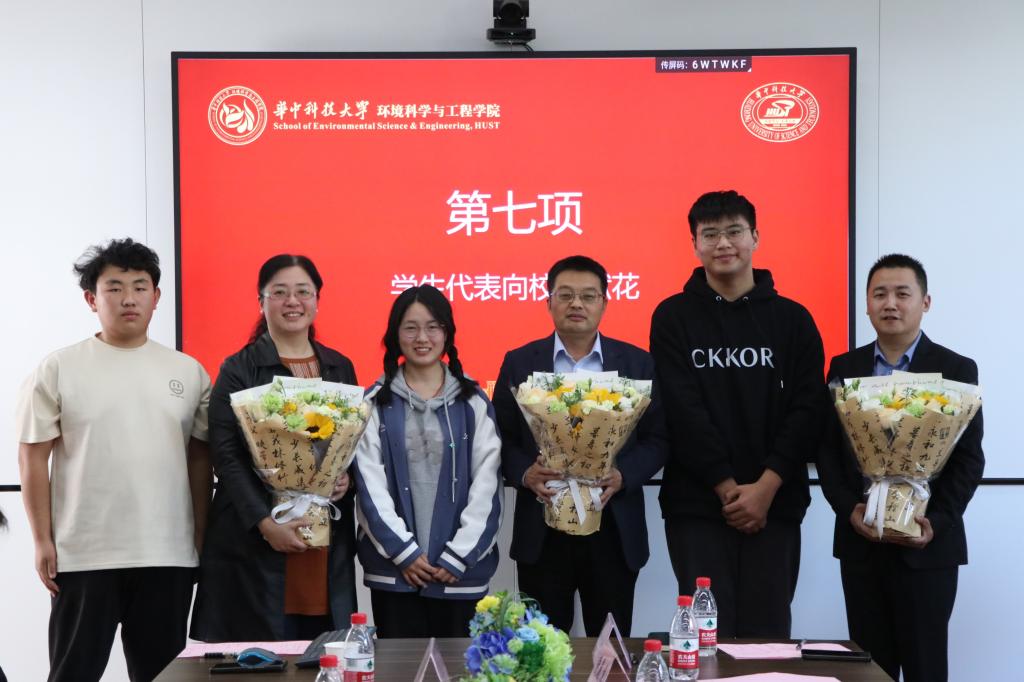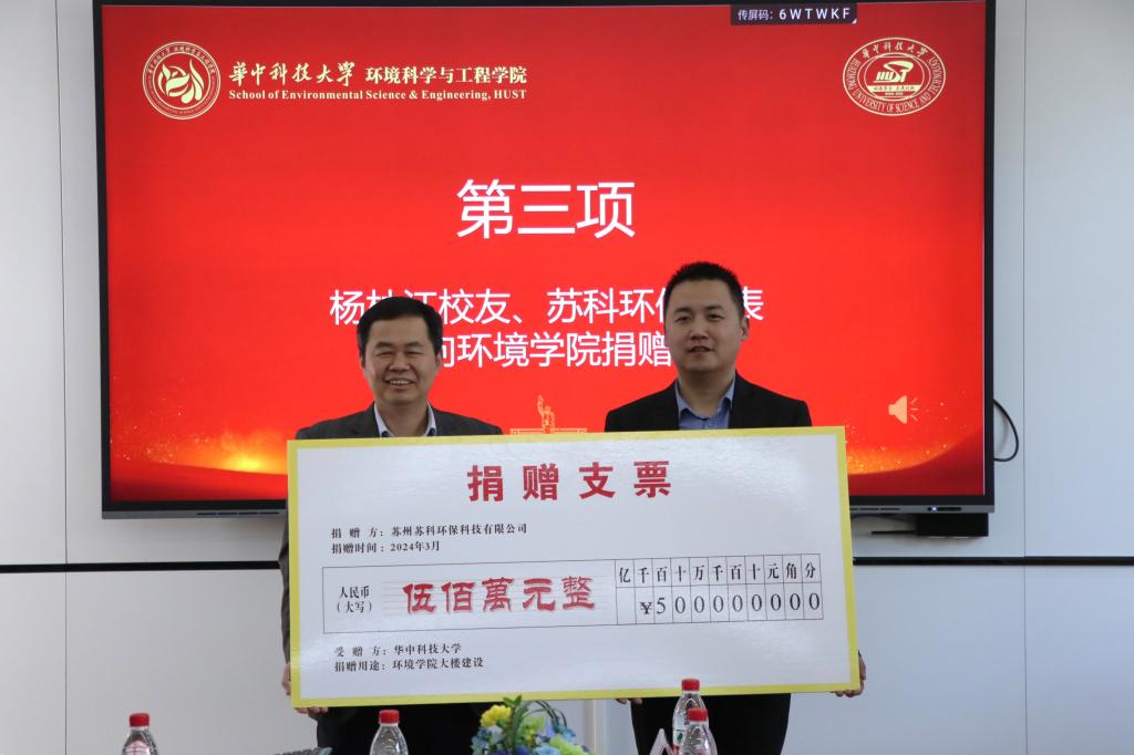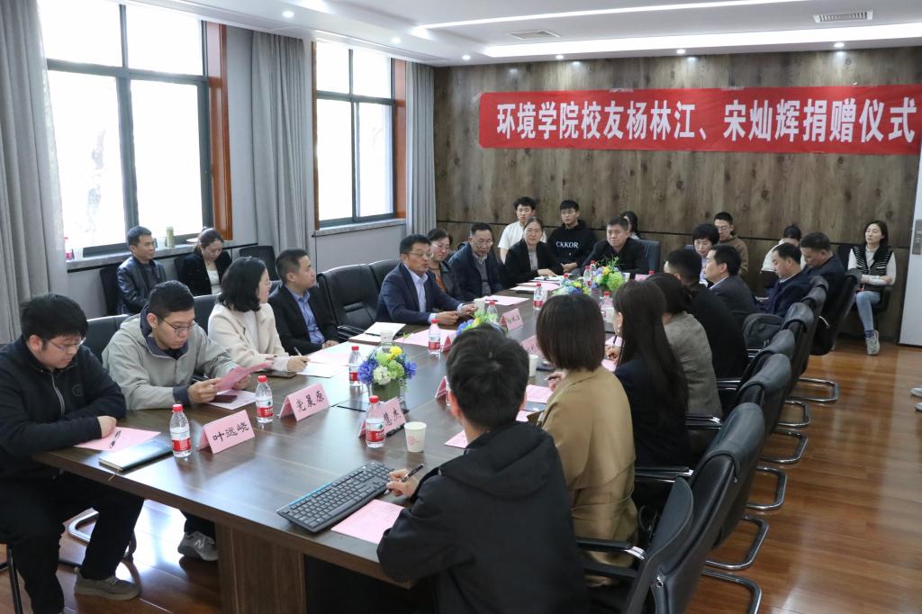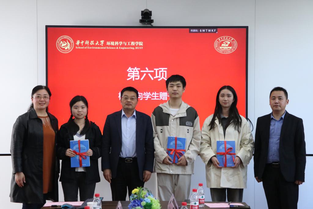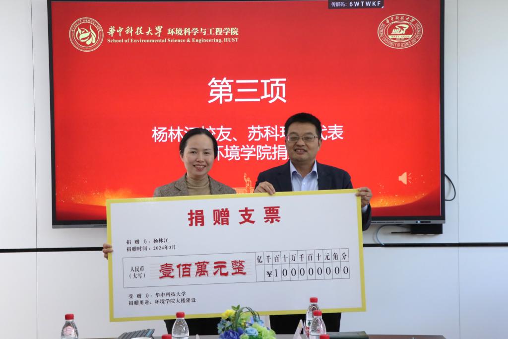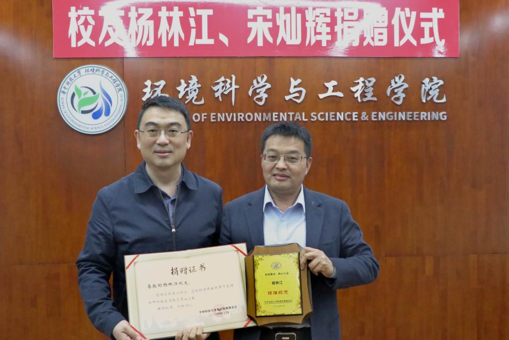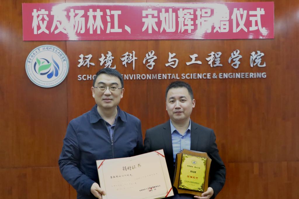 校友杨林江、陈翔宇向环境学院党委书记刘利剑、院长杨家宽赠送捐赠支票。