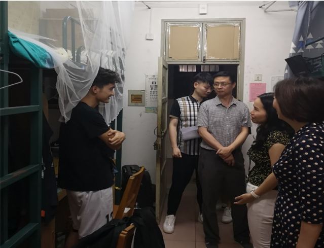 走访过程中,各位老师与同学们进行了亲切交流,了解了同学们的住宿、生活、学习、就业等情况。交流过程中,老师们希望同学们加强自我管理、提高安全防范意识,养成健康文明、积极向上的生活习惯,营造干净舒适、整洁卫生的生活环境。轻松愉悦的氛围中,老师们走进108宿舍,来自西藏的格桑顿珠同学正在认真学习英语。老师们亲切询问了格桑顿珠同学的学习情况;了解了该同学在语言、饮食、生活习惯方面的适应情况,鼓励他在专业学习的同时,积极参与社会实践活动,为将来返回家乡参与建设贡献自己的力量。走访高年级学生宿舍时,老师们敦促同学们勇于攻坚克难,积极参与科学研究,为将来继续深造学习打牢基础。